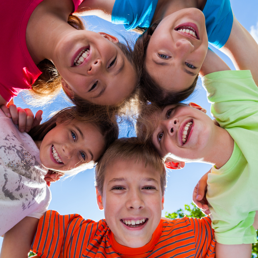 Five smiling children huddle in a circle outdoors, looking down at the camera against a bright blue sky, symbolizing friendship and joy.